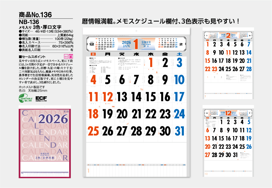 見やすい日付と広いメモスペース。更に下段には、1ヶ月間の予定が一目で分かるスケジュール欄を設けました。旧暦・九星・六曜・六十干支・二十四節気はもちろん、健康メモや日本の行事、農事暦まで生活情報満載。名入れ色は、基本7色(濃紺・黒)より選べます。