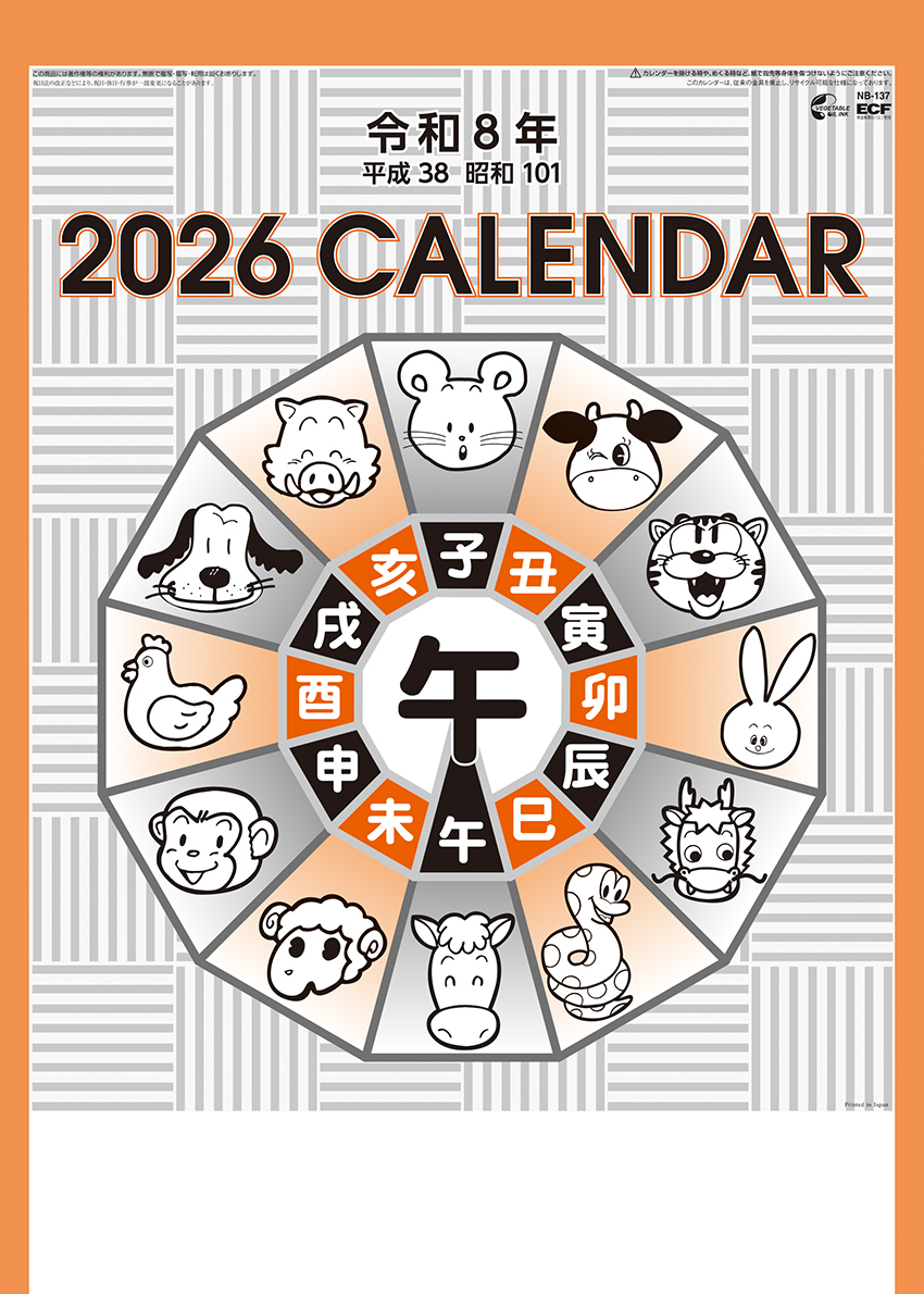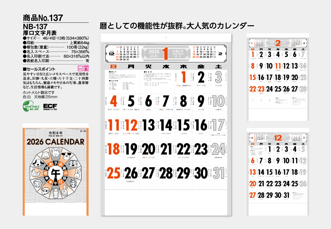 見やすい日付と広いメモスペースで実用性を追及。旧暦・九星・六曜・六十干支・二十四節気はもちろん、健康メモや日本の行事、農事暦など、生活情報も満載です。名入れ色は、基本7色(朱・藍・緑・赤・紺・濃紺・黒)より選べます。