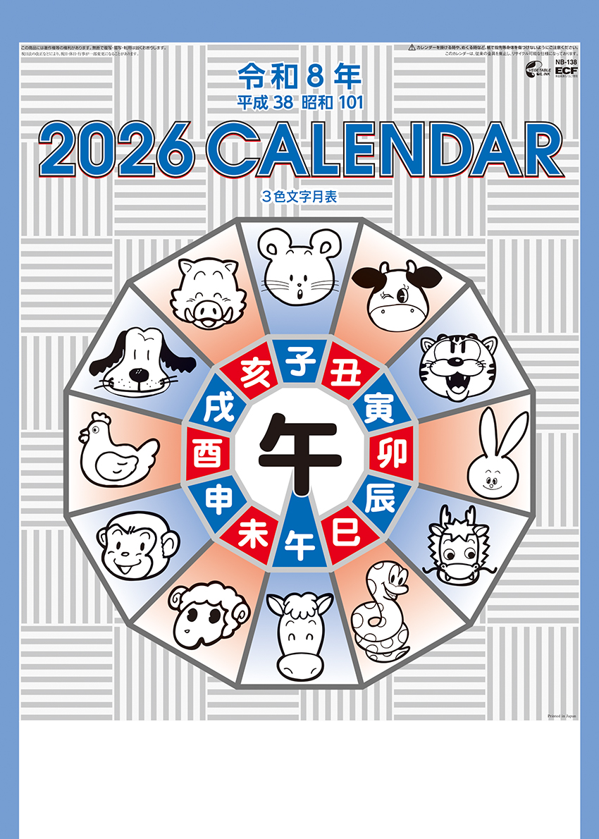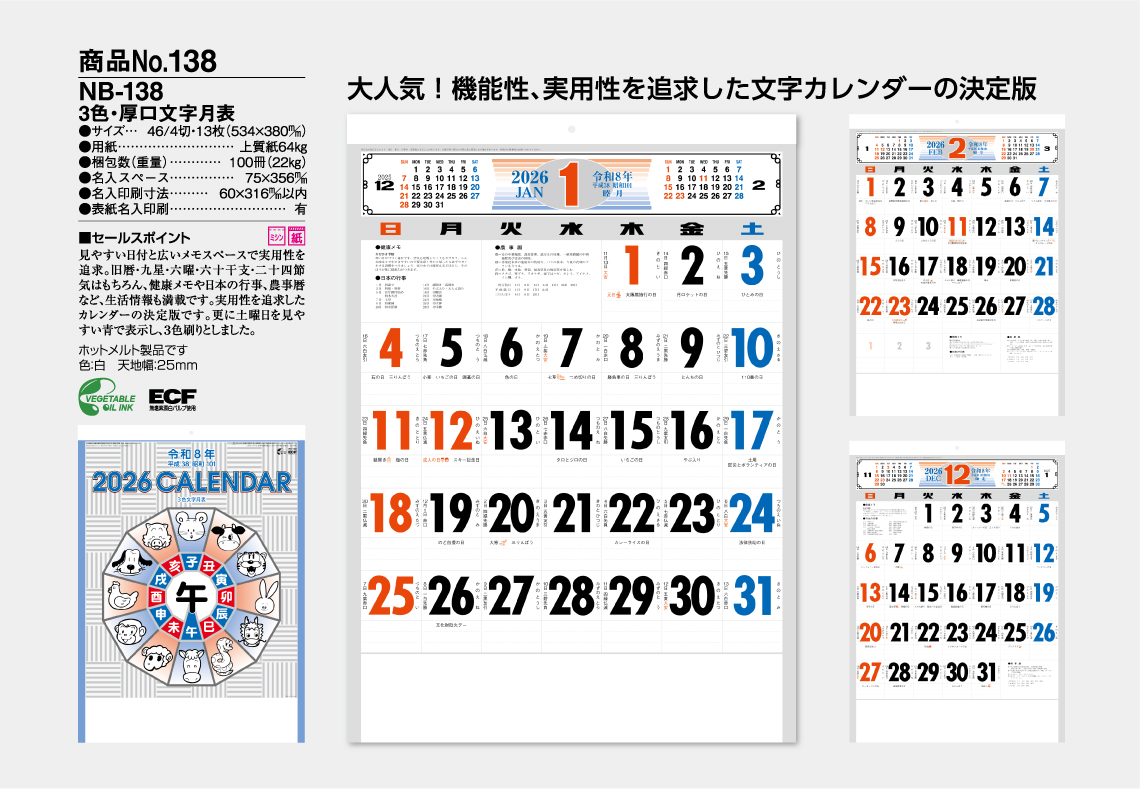 見やすい日付と広いメモスペースで実用性を追求。旧暦・九星・六曜・六十干支・二十四節気はもちろん、健康メモや日本の行事、農事暦まで生活情報満載。実用性を追求したカレンダーの決定版です。更に土曜日を見やすい青で表示し、3色刷りとしました。名入れ色は、基本7色(朱・藍・緑・赤・紺・濃紺・黒)より選べます。