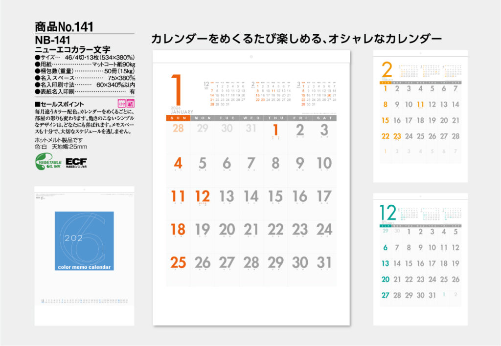 毎月違うカラー配置。カレンダーをめくるごとに、部屋の彩りも変更わります。飽きのこないシンプルなデザインは、どなたにも喜ばれます。メモスペースも十分で、大切なスケジュールを逃しません。名入れ色は、基本7色(濃紺・黒)より選べます。