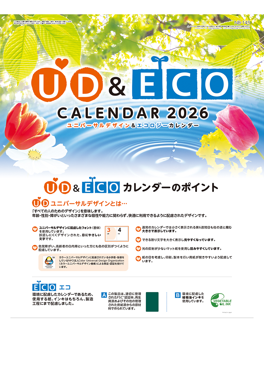 年齢・性別・障害など、さまざまな個性や能力に関わらず、全ての人が快適に利用できるデザインに仕上げました。また、環境に配慮された紙やインキを使用した地球に優しいカレンダーです。名入れ色は、基本7色(朱・藍・緑・赤・紺・濃紺・黒)より選べます。