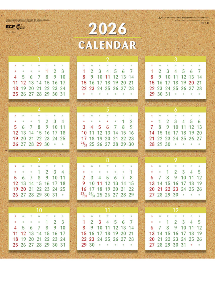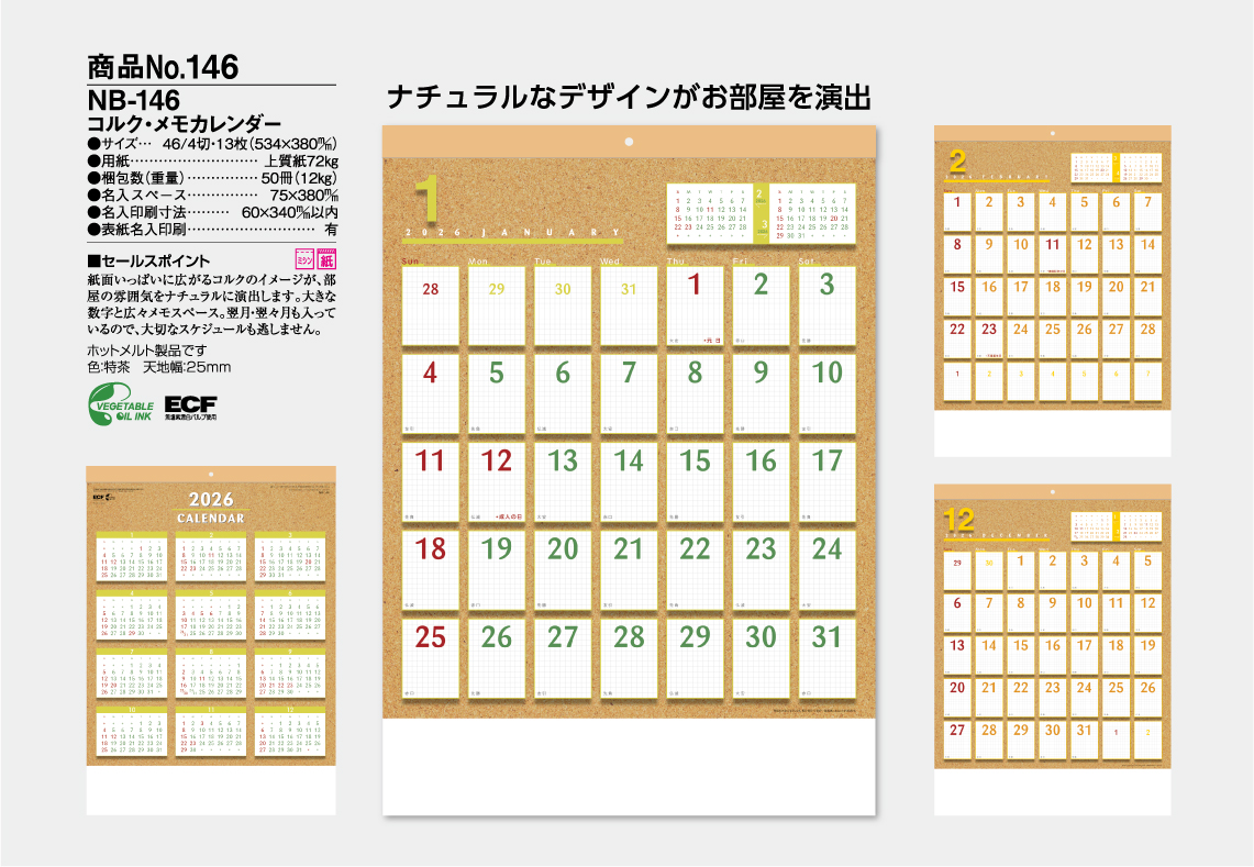 紙面いっぱいに広がるコルクのイメージが、部屋の雰囲気をナチュラルに演出します。大きな数字と広々メモスペース。翌月、翌々月も入っているので、大切なスケジュールも逃しません。名入れ色は、基本7色(朱・藍・緑・赤・紺・濃紺・黒)より選べます。