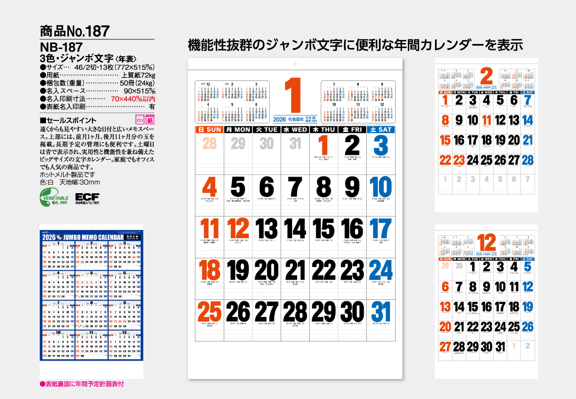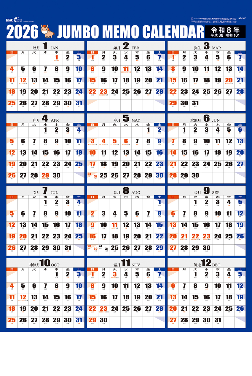 遠くからも見やすい大きな日付と広いメモスペース。上部には、前月1ヶ月後月11ヶ月分の玉を掲載。長期予定の管理にも便利です。土曜日は、青で表示され、実用性と機能性を兼ね備えたビックサイズのカレンダー。ご家庭でもオフィスでも人気の商品です。名入れ色は、基本7色(濃紺・黒)より選べます。