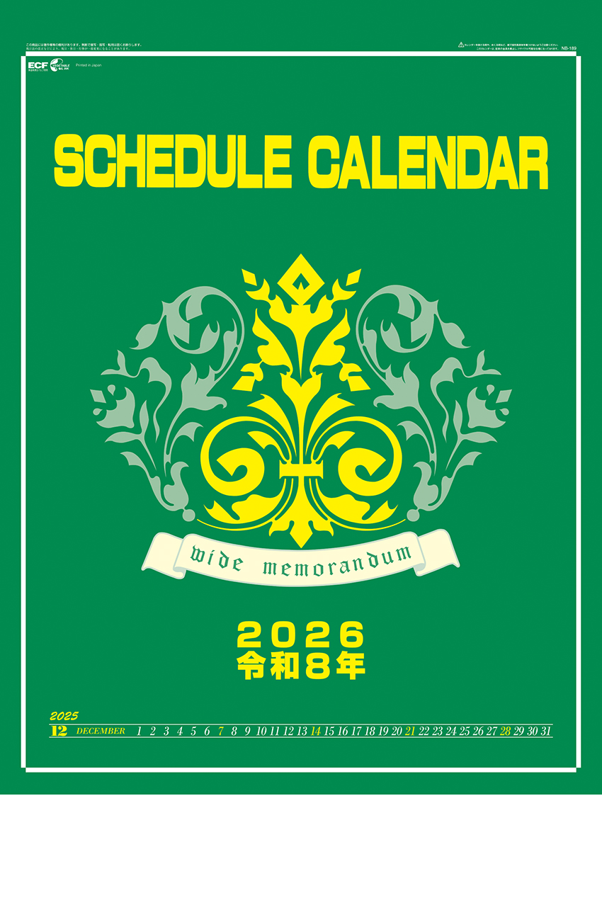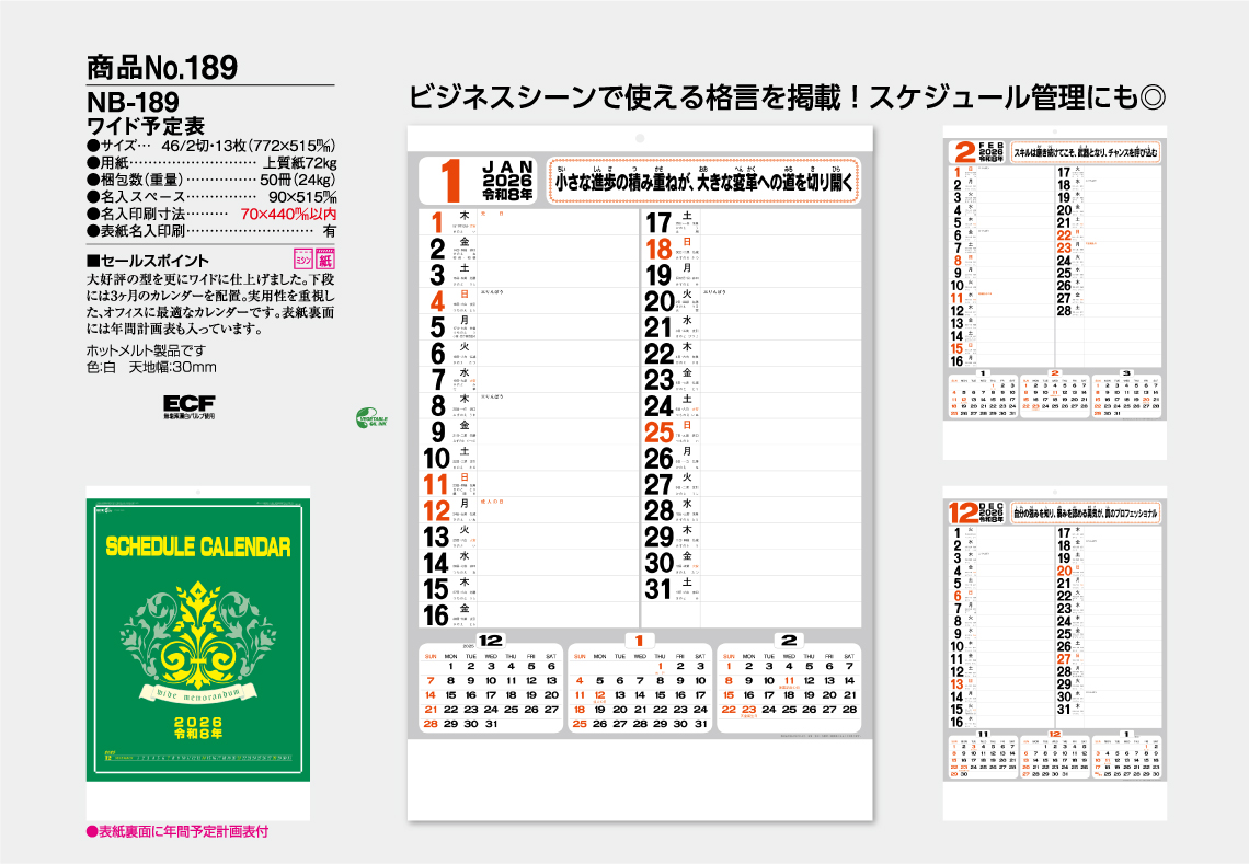 大好評の型を更にワイドに仕上げました。下段には3ヶ月の玉を配置。実用性を重視した、オフィスに最適なカレンダーです。表紙裏面には、年間計画表も入っています。名入れ色は、基本7色(朱・藍・緑・赤・紺・濃紺・黒)より選べます。