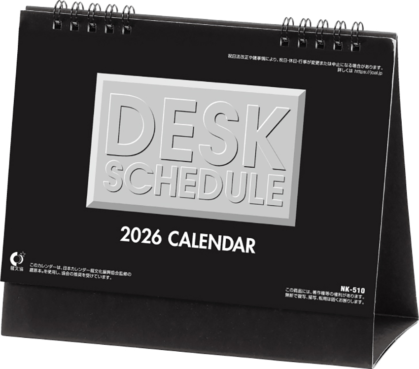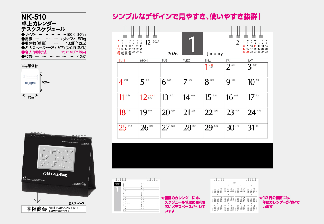 シンプルなデザインの卓上カレンダーです。見やすい数字と広いメモスペースが大変便利!